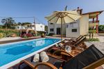 Umgeben ist das Haus von einem großen Grundstück mit Obstbäumen. Begrenzt wird das Grundstück, auf dem sich auch der Parkplatz befindet, von einer weißen Steinmauer. Den Gästen steht ein 24 m² großer Pool mit Liegebereich zur Verfügung. Zum Entspannen gibt es dort zwei Liegen, einen Sonnenschirm und zwei kleine Beistelltische. Auf der Terrasse, die mit Tisch und vier Stühlen ausgestattet ist, können Sie es sich zum Frühstücken oder auch zum Grillen bequem machen. Dabei genießen Sie einen herrlichen Ausblick auf die Berge und auf das Meer.